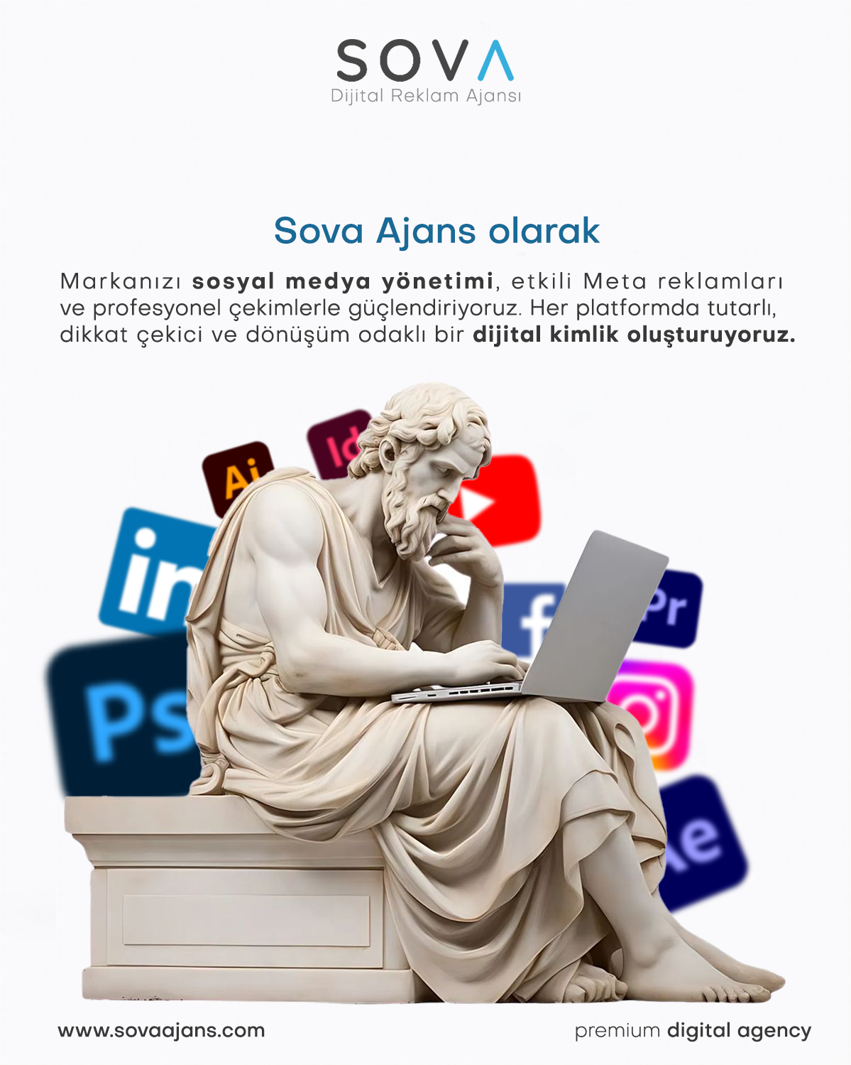Sova Ajans; web tasarımı, logo ve kurumsal kimlik tasarımı, grafik tasarım, sosyal medya yönetimi, Google & Meta reklam yönetimi, SEO çalışmaları ve dijital pazarlama stratejileri alanlarında profesyonel çözümler sunar.